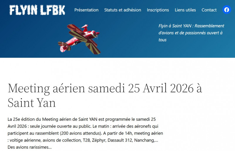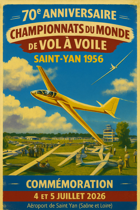 Retenez la date du 25 avril. C'est le meeting "Flyin à Saint Yan". Et puis les 4 et 5 juillet. C'est le week-end de comméoration du 70ème anniversaire des championnats de vol à voile de Saint Yan.