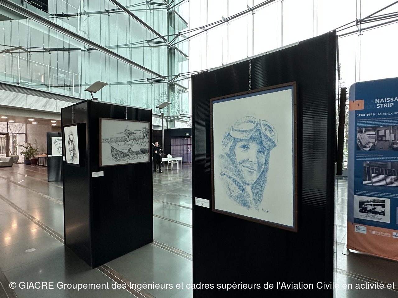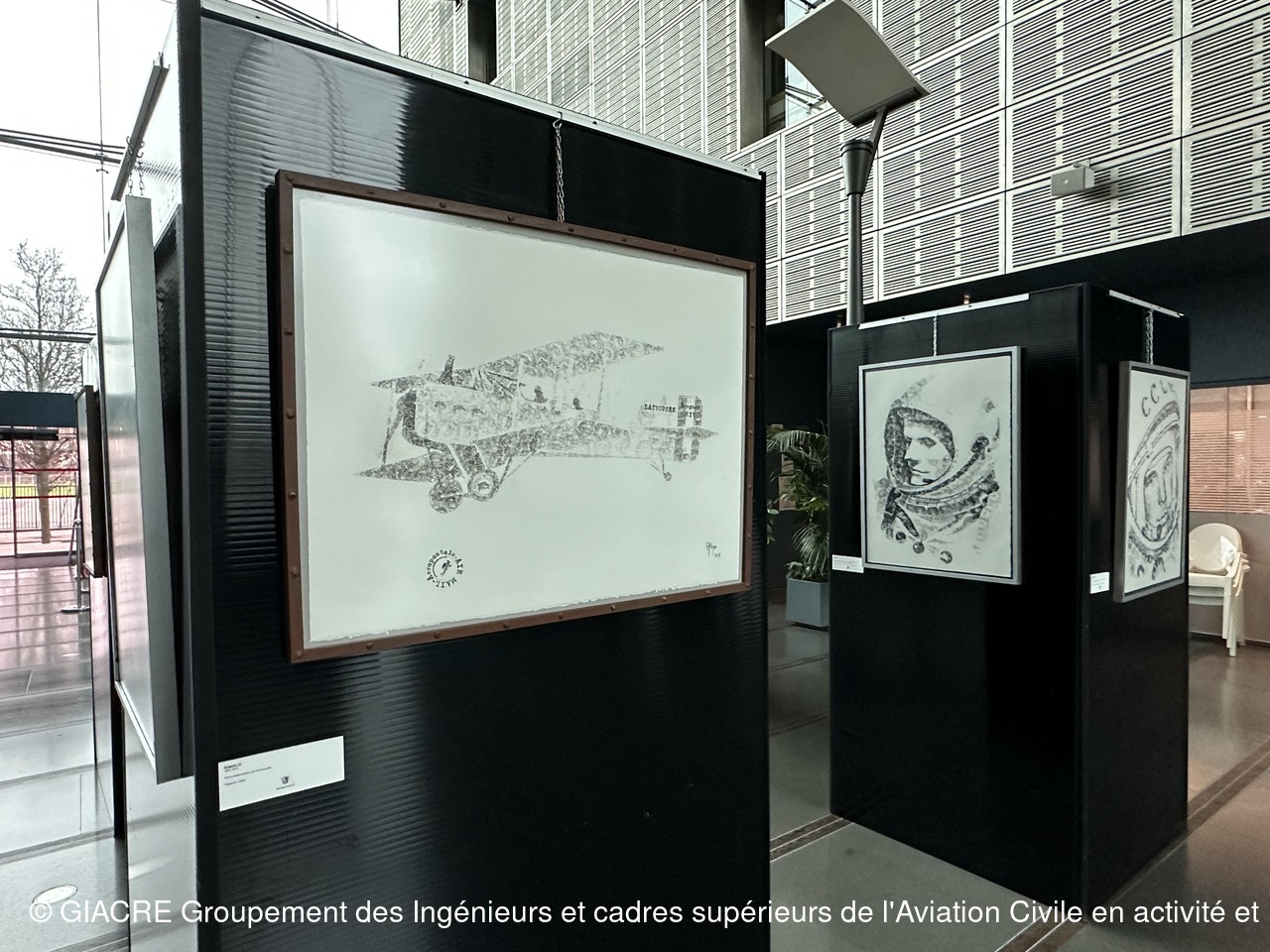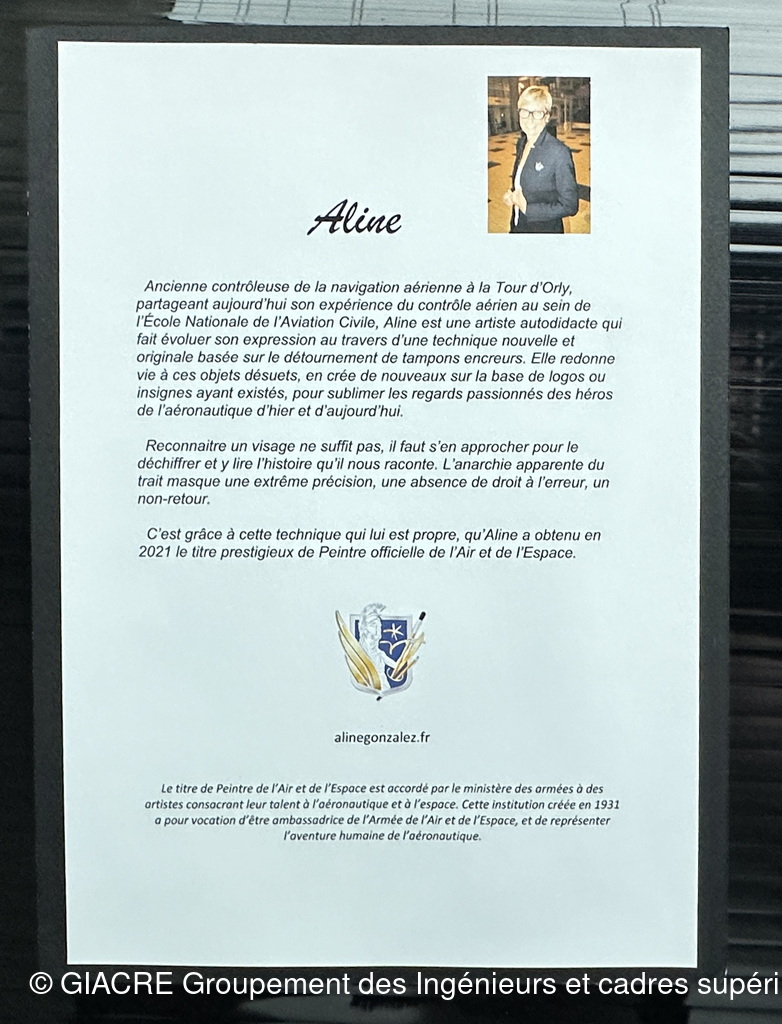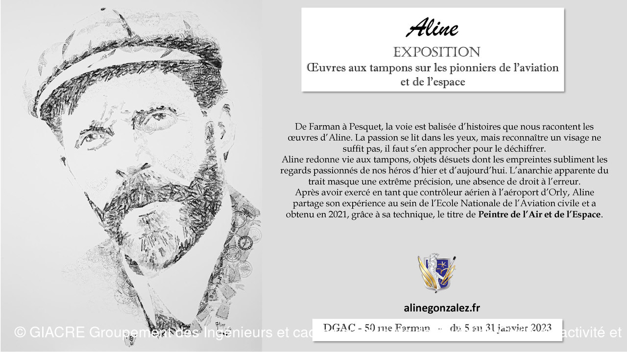 Aline Gonzalez, ancienne contrôleuse de la navigation aérienne à la tour d'Orly, partage aujourd'hui son expérience du contrôle aérien au sein de l'Ecole Nationale de l'Aviation Civile. C'ezst une artiste autodidacte qui fait évoluer son expression au travers d'une technique nouvelle et originale basée sur le détournement de tampons encreurs. Elle redonne vie à c es objets désuets, en crée de nouveaux sur la base de logos ou insignes ayant existé, pour sublimer les regard passionnés des héros de l'aéronautique d'hier et d'ajuord'hui.